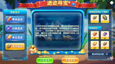 玩法:总共有4探索点,我们选择探索地点,使用对应的弹头前往遗迹进行探索,每次探索会获得7点活力值,通过点选宝箱区域,对全部火力进行分配,驱逐守护鱼并获取宝箱内的财富。