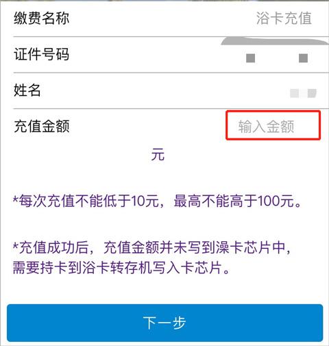 以浴卡充值为例,直接输入金额,点击“下一步”跳转到支付平台,支付成功即可