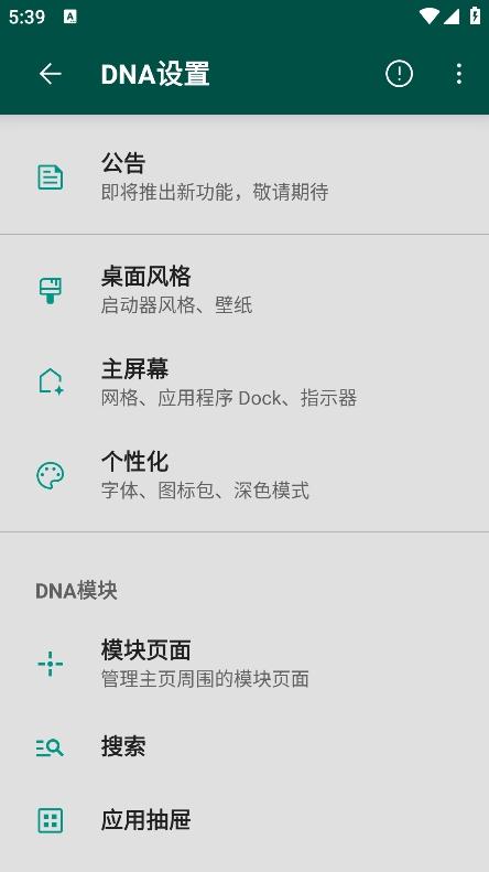 4、在dna设置中,用户可以对桌面风格、主屏幕、模块页面、搜索、应用抽屉等进行设定。
