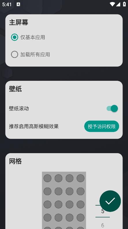 1、打开软件后进行基本的设定,对壁纸、网格、字体等进行个性设置,点击对钩图标进入桌面;
