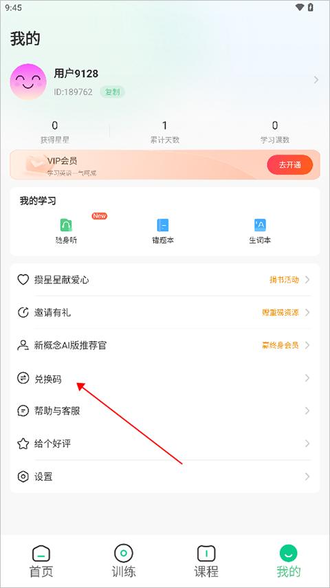 用户打开并登录新概念AI版app后进入【我的】页面下点进【兑换码】