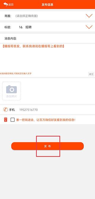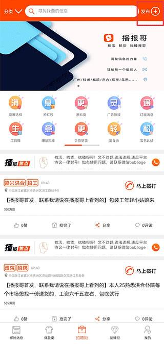 1、打开播报哥app,在招聘街界面点击右上角发布+号