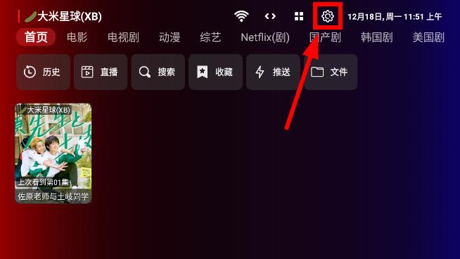 2、首先大家将该软件安装到电视机上,然后打开进入软件主页,点击右上角的设置。