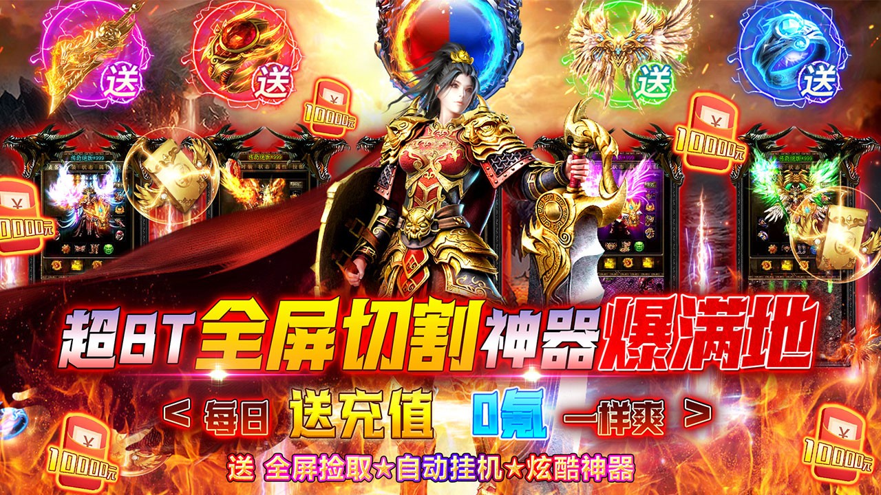 1、创角福利:上线送全套终极技能★全屏捡取★自动挂机★炫酷神器!
