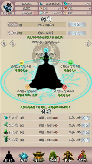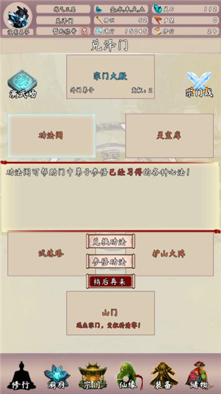 7、宗门:五大宗门,分别对应金-木-水-火- 土。 进入宗门后,可修习对应功法,炼制对应法宝。 在任务楼接取任务后,将自动获取贡献。 当贡献与试炼塔都满足条件时,可在弟子居提升身份,身份越高,获取贡献的效率越高。 当成为掌门时,可在大殿免费领取宗门传承法宝,同时可消耗声望,攻打其他宗门。