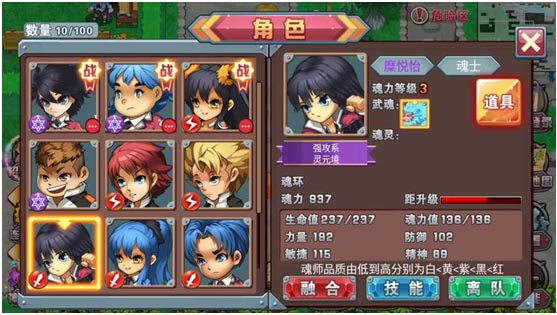 游戏中的角色分为:强攻系、敏攻系、控制系、辅助系、防御系五种类型,对应的力量、敏捷、精神、魂力、防御几项属性优势。合理的搭配才能愉快的玩耍。