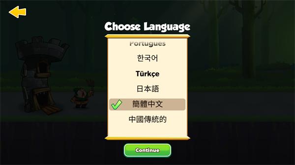 1、在本站下载并安装游戏后打开游戏,首次进入游戏可以设置游戏的语言,只需下拉找到简体中文点击Continue即可。