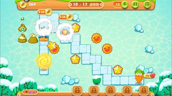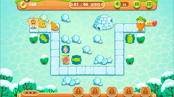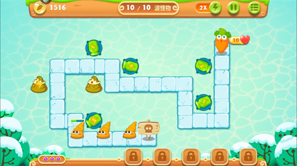 9、如果萝卜被咬了10口则会游戏失败,所以玩家尽可能的要多建造炮塔;