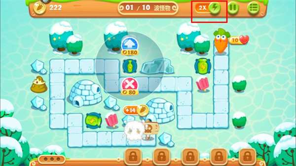 1、保卫萝卜2国际服操作十分简单,只需点击地图中闲置区域就可以安置炮塔。