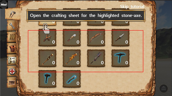 3、玩家可以进入工具栏,使用刚刚拾取的树枝来制作各种武器,用来捕猎或者保护自己。