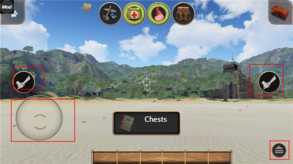 游戏采用第一视角,屏幕左右两侧虚拟圆圈分别控制移动以及视角,圆圈上方分别有二个动作指令按钮,动作指令按钮会根据不同的指令变化完成攻击,建造,采集等动作。