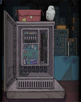 3、地上捡起玻璃瓶,电箱上面有一只孵蛋的猫头鹰,等下回来找他。