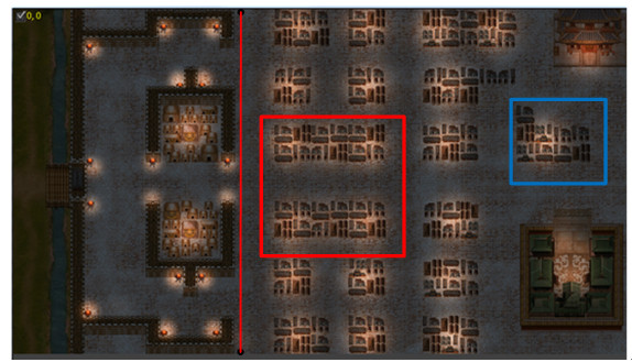 此关为秦用死劫关。我军只能在民居上行走,每第一次进一个民居都会在附近民居上触发强行的刺客,刺客到达红线就会触发一波伏兵,包括两个步兵两个枪兵两个弓兵。蓝框处超过三人会触发两个强行的刺客。如果同时触发4波或以上的伏兵秦用会触发中伏剧情,14回合若未主动进瓮城会自动触发中伏剧情。所以本关关键在于尽可能的在不触发新刺客的前提下清刺客。建议出战张紫嫣尚怀忠(有罗松的上罗松),有窦线娘的玩家窦线娘必出站,没羽箭攻击可以打到相邻的民居,很好用,张紫嫣加好强行。如果已经触发伏兵可在红框内民居清完伏兵再分兵上下清刺客。可以大部队在红线附近守株待兔,让跑得快的人去踩雷,把刺客都踩出来。清完刺客后进瓮城触发瓮城内敌军,程咬金到达城门附近时徐茂公出现。徐茂公对话秦琼后徐茂公才会触发撤退。秦用学特技条件:红线以左无敌军(井栏也要杀),秦用在瓮城内。只要挡住门口,清掉井栏即可。二周目全灭过关奖励秦用成长点,有皮肤再额外奖励两点。