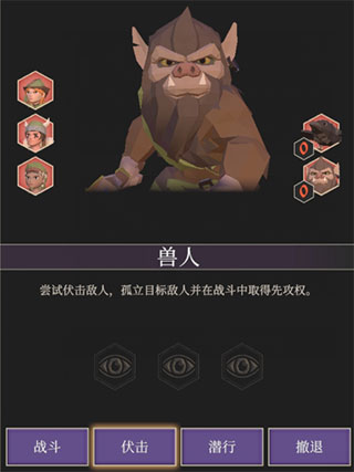 啊哦!小编遇到了兽人勇者,这时候会有战斗、伏击、潜行、撤退4个事件选择,每个事件选择都和会玩家属性值相关,这里布林酱想选择与敏捷值相关的潜行!
