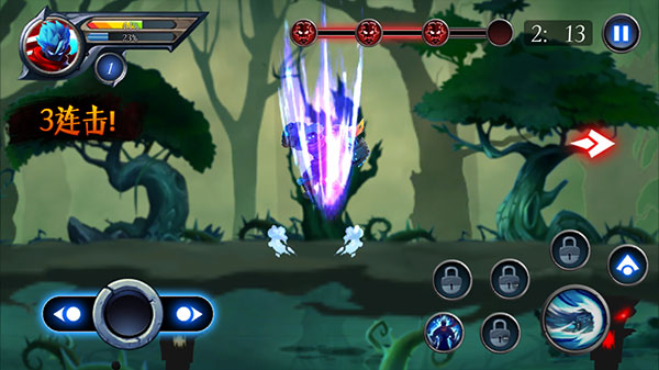 4、进入后左下角按钮左右互动控制你的英雄移动,而右下角的按钮是攻击和跳跃,连续按可以在空中攻击,其他三个按钮是技能按钮,需要达到一定等级才可以解锁。