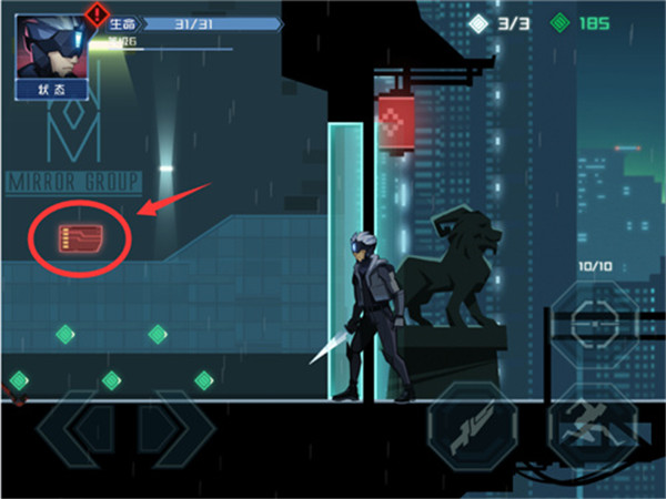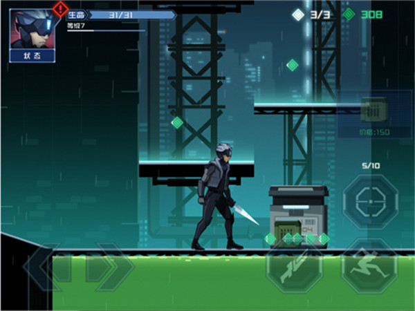向右奔跑,跃下平台。首先玩家向左行走,遇到一个街头小混混,小混混的攻击力比较低,玩家可以使用刀具近身攻击,击倒小混混之后,解锁第一个隐藏芯片。