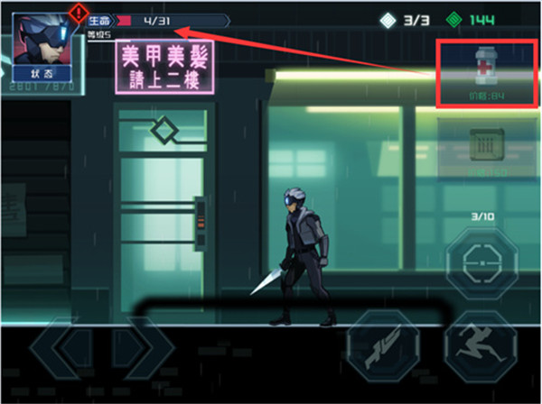 向右奔跑会遇到电子狗,这里可以使用远程武器,手枪进行攻击。值得注意的是,手枪攻击距离远,威力大。但是缺乏子弹,一开始只有10发子弹,用完了玩家可以随时补充,但是需要支付150金,这对于前期的萌新玩家来说,真的是一笔不小的支出呢。不过前期,只要注意一下站位与攻击技巧,玩家完全不需要使用枪这种昂贵的武器。
