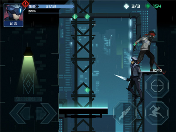 玩家需要小心操作在几个平台上跳跃潜行,有的平台上还有小混混,玩家一靠近平台就会被攻击。所以一旦跳落平台就需要发动攻击,玩家也可以一边跳一边用枪将小混混打死。玩家每次攻击小混混的时候注意不要站在小混混的正前方,每次攻击都能打断小混混的攻击准备动作。所以,攻击小混混的时候请注意与小混混交错站位。