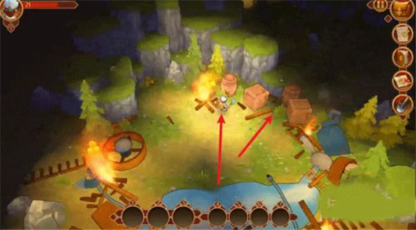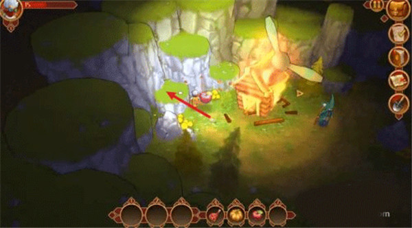 3、在开局玩家就捡到了一个铲子,每个地图都有固定数量的宝箱分别藏在各种隐蔽的地方,当玩家靠近宝箱右侧ui的铲子图标就会闪烁说明这个地方下面有宝箱可以挖掘。地图里的树木石头都可以攻击获得材料,宝箱一般都被树木和石头遮起来。