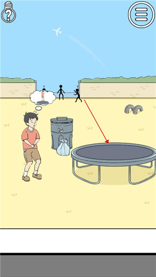 1、拾取后方小人玩的篮球,将篮球交给主角,主角会丢出篮球,而狗狗会去追篮球。待狗狗离开以后,点击蹦床,主角就能如愿玩上蹦床,顺利过关啦!