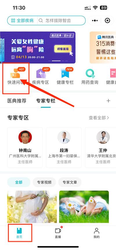 2、用户点击底部的【首页】,点击上方的【快速问诊】