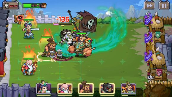 2、每场战斗玩家将派出至多5名英雄进行战斗,玩家可根据每一关的关卡特性,灵活调配上场人员的配置;