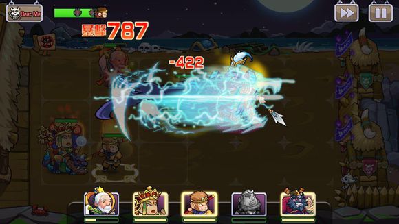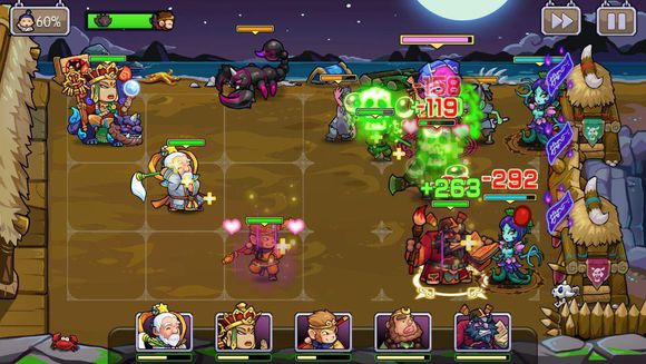 3、战斗开始时五名前线队员排列在屏幕右半部的九宫格内,敌人由屏幕右方进入战场并向本方英雄发动进攻;
