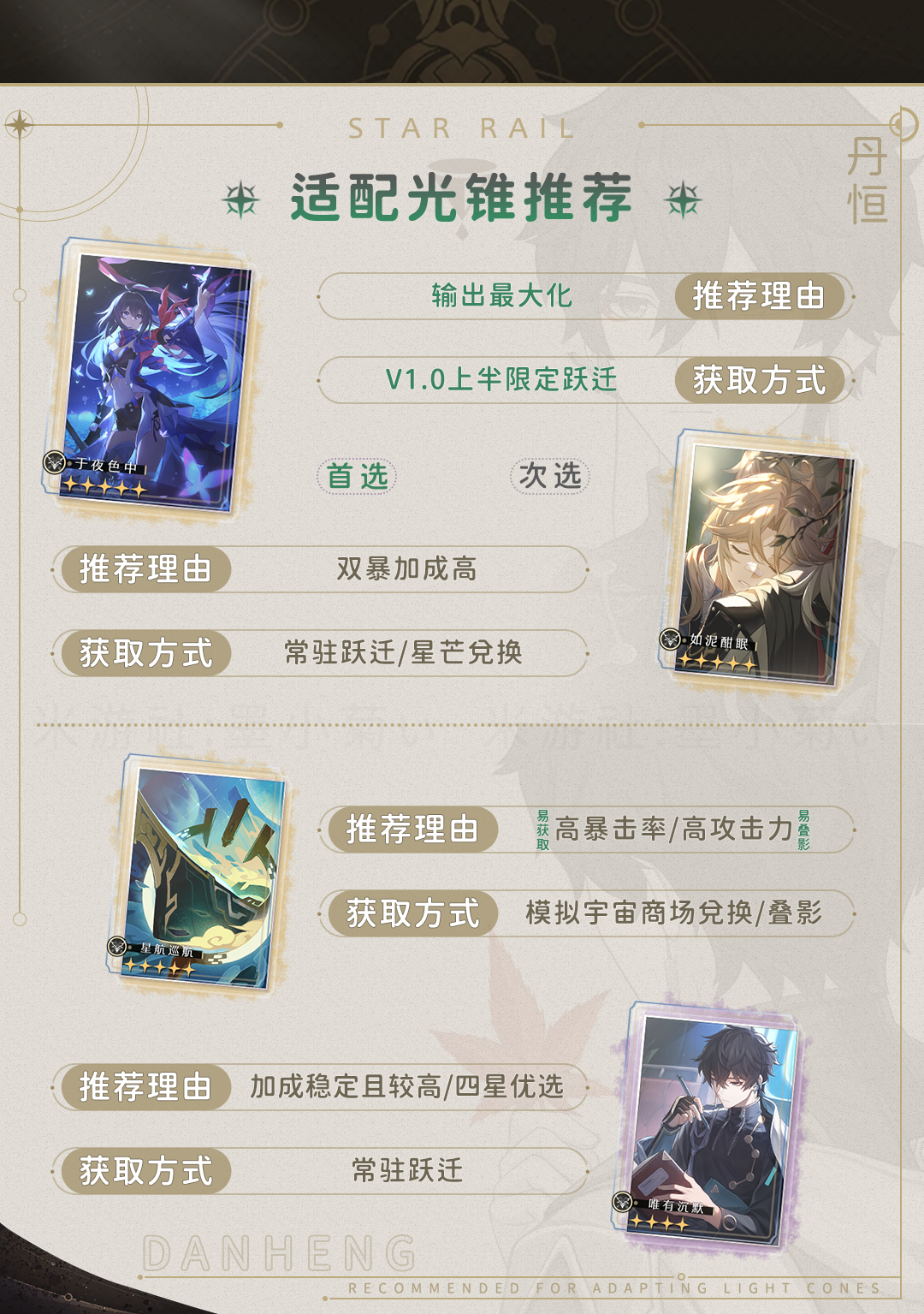 「于夜色中」:希儿同期up光锥池中的限定五星巡猎光锥,巡猎角色的三种基础伤害类型均能得到加成,且丹恒能够为自身提供速度加成来提高该光锥收益,对丹恒来说是输出收益最高的光锥。