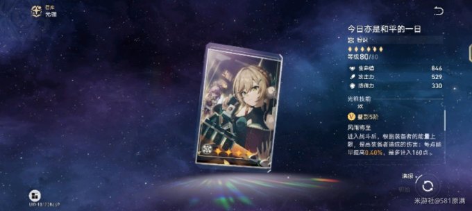 作为目前唯一一个限定智识光锥,虽然不是十分契合青雀,但是从基础数据和暴击伤害加成而言是目前对青雀而言提升最大的光锥了。