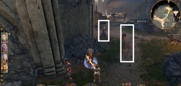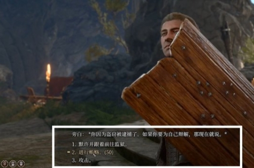 需要注意的是,这个商人前面有三个人在那打嘴炮,我们要先把他们劝走。上前对话直接游说,记得投骰子前保存防止脸黑