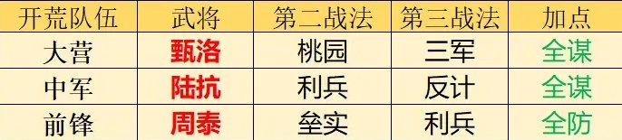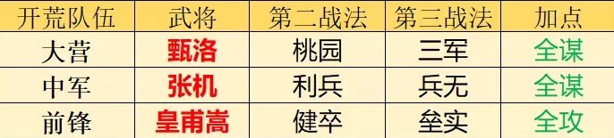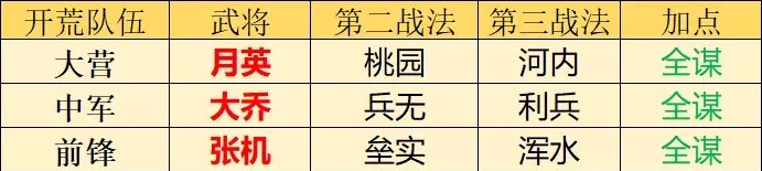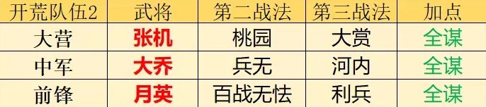 之前金印本用过这队直接开荒,开荒战法有调整,打架战法不变,前期发育极快,打架也是低损,实用性很高的队伍,但吃主流武将张机。