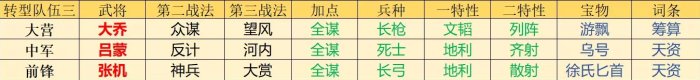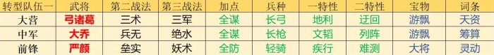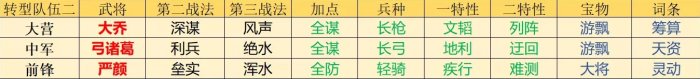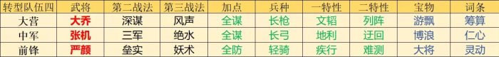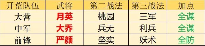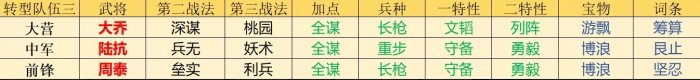 开荒首选阵容,稳定性极高,战损低,但偶尔看大乔的发挥,缺点是转型队伍强度不是太高,仅作为开荒过度,后期不转型大乔法刀或流氓,常降配用语主城以外的第六队。