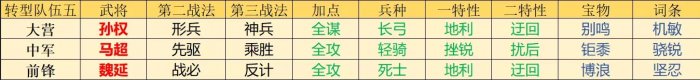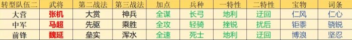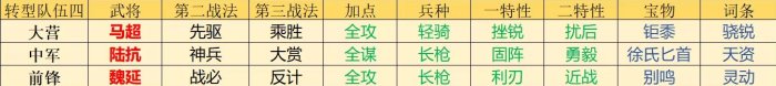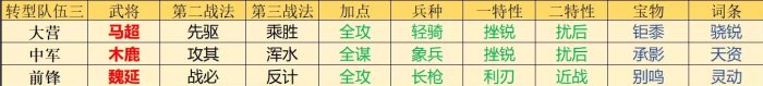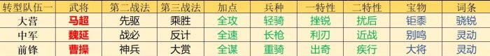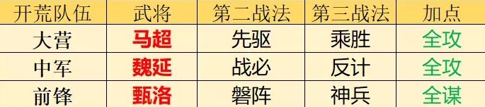 新手入门级别的开荒,优点是无脑,开荒速度快,操作难度低,缺点新本对于马超开荒的不是太友好,转型后吃顶配战法,影响出2、3队的顺序,并且当前版本需要二次转型玩大菜刀。