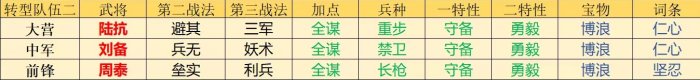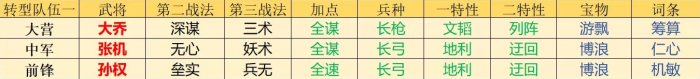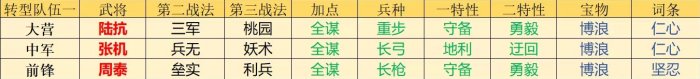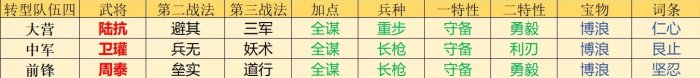 吴步的玩法,转型速度快,但吃一定的战法,这队当前版本不建议再去搭配避其,三军,重整等减伤和恢复类的战法,吴步之前一直是我很喜欢的一支队伍,我测试了很多玩法,目前这套相对理想一点。