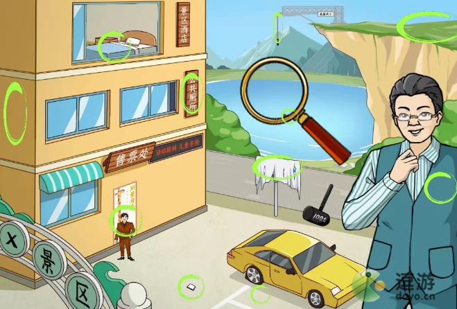 2、然后移动放大镜到墙壁、路牌、湖中、绳子、悬崖、男人胸口、厕所牌子,找到对应问题