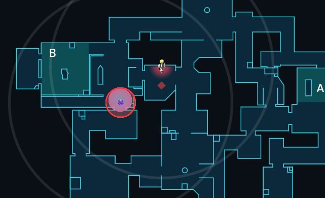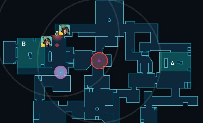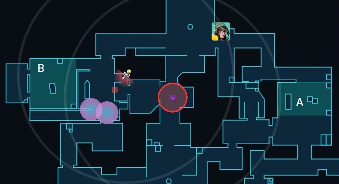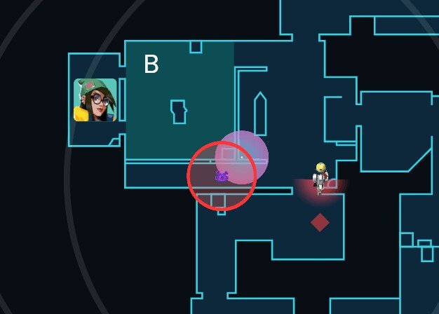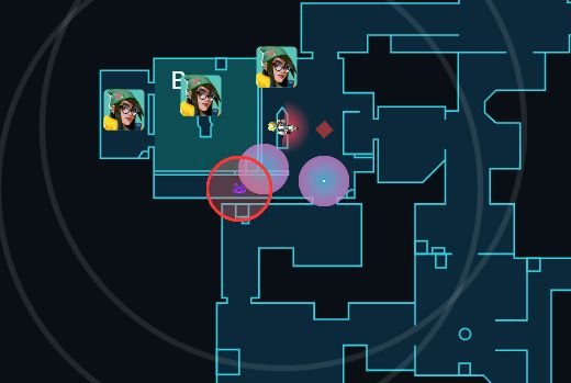 这个站位可以确保我们离b点足够远,ko在b通开大时不会沉默到我们,同时保证了机器人和炮台都在我们的激活范围,市场队友防守b点时,我们可以帮忙看住中路。如果对手选择打a点也可以做到第一时间的回防。