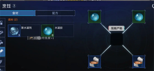 玩家需先在全市民广场所在的“伊甸城”地图中寻找含有深海鲔鱼糜的罐头,对于水凝胶则需要在适当的气象条件下收集。在实施原料收集活动之前,玩家们应在家园里配备物理过滤器,以保证能从露水中得到纯净优质的水源。取得所需的洁净水源后,将其引入至加工平台,通过特定的化学处理程序便可合成所需的水凝胶原材料。