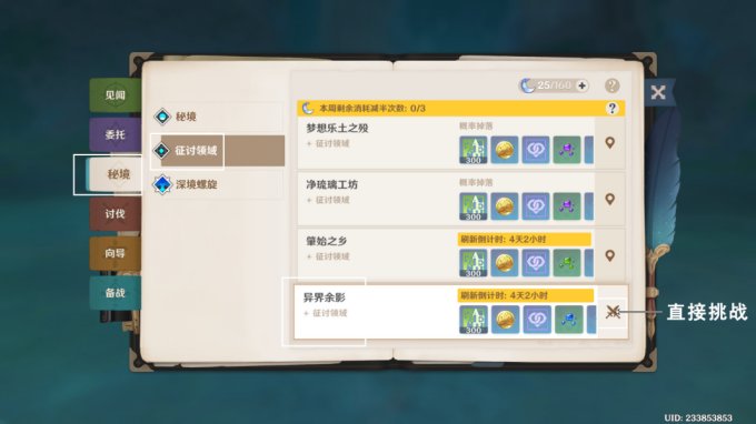 可从冒险指南-秘境-征讨领域-异界余影,直接挑战
