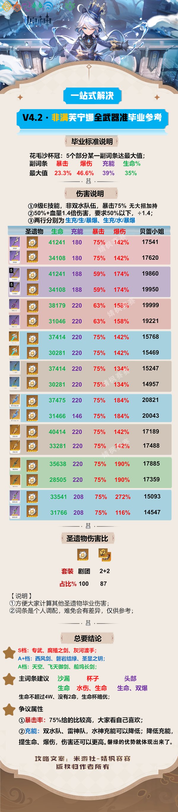 《原神》芙宁娜毕业面板 水神非满命全武器毕业伤害属性参考
