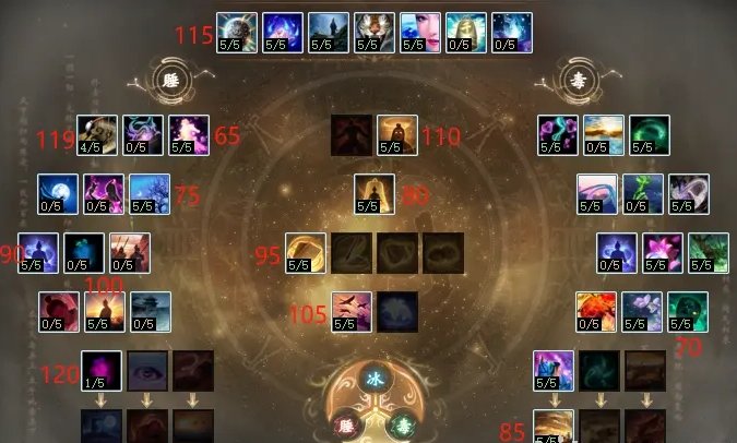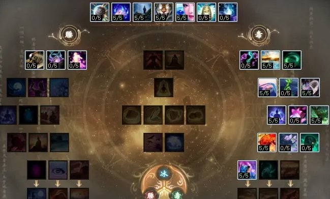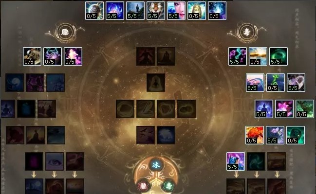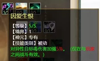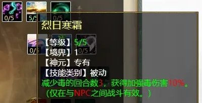毒天赋第一排三个技能,分别是:因爱生恨(PK专用,对男角色毒伤加强),烈日寒霜(任务专用,减少毒发回合,加强毒伤害),此消彼长(任务、PK通用,出五法毒时目标少于5,则可提高毒伤害)