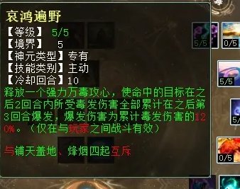 哀鸿遍野:PK专用,主动技,强力五法毒,毒伤积累2回合,到第三回合一次性爆发。冷却10回合。