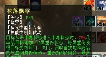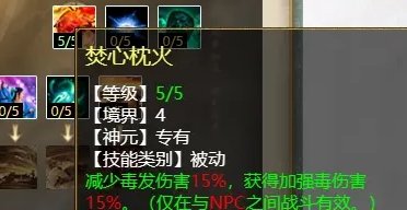 毒天赋第四排三个技能,分别是:焚心枕火(任务专用,减少毒发伤害,获得加强毒伤),花落飘零(任务、PK通用,给被毒的单位附加重伤状态),反蛊惑心(任务、PK通用,受到物理攻击时几率进行毒法反击)