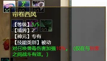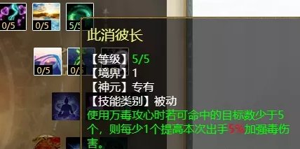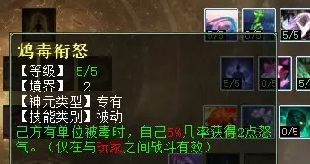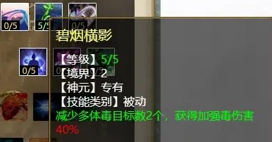 毒天赋第二排三个技能,分别是:帘卷西风(PK专用,对BB增强毒伤害),碧烟横影(任务、PK通用,减少2个毒单位,增加毒伤害),鸩毒衔怒(PK专用,己方有单位被毒时,自己几率获得2点怒气)