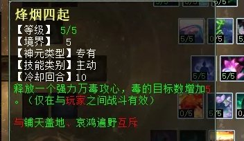 烽烟四起:PK专用,主动技,配合“碧烟横影”使用,可毒10个单位。冷却10回合。