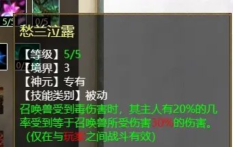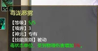 毒天赋第三排三个技能,分别是:修魂固魄(任务、PK通用,在战斗中提高人法抗性),愁兰泣露(PK专用,毒到BB时,20%几率让其主人也受到伤害),毒泷恶雾(任务、PK通用,被毒的单位受到物理伤害增加)