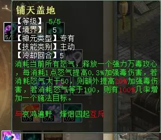 铺天盖地:任务、PK通用,主动技,消耗怒气增加毒伤,满100怒气可增加1个目标,冷却5回合。惟一一个不需要满100怒气就可使用的大招。