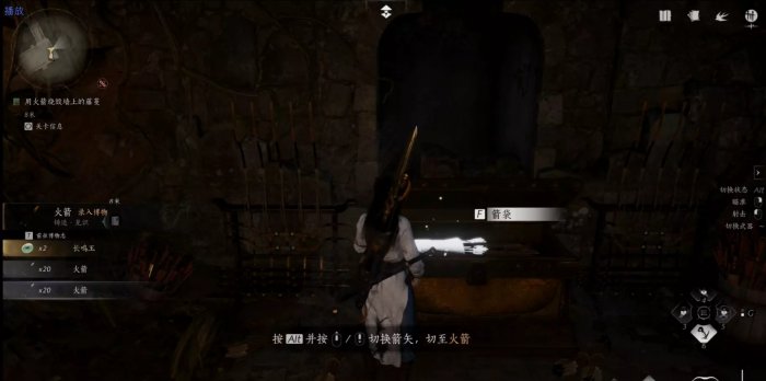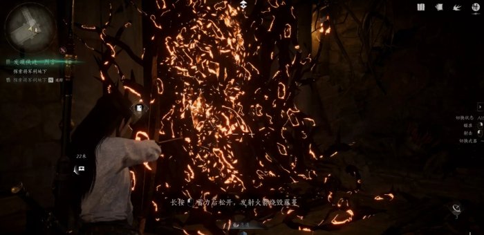 先按【~】键将武器切换弓箭,再按Alt+鼠标滚轴,将普通切换箭矢切换为【火箭】后,再射箭即可燃烧。