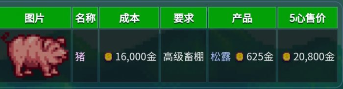 养猪是极为推荐的,松露的单价是最高的,松露油的价格更是达到了1000左右,可以通过学习收集者(双倍收获)和植物学家(变成依星)两个技能提高松露的产量和质量。