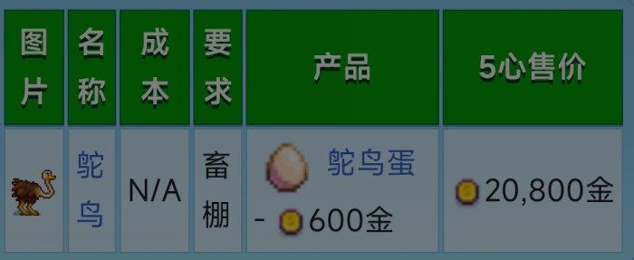 获取方式:(除了鸵鸟都可以在玛妮的牧场获得)