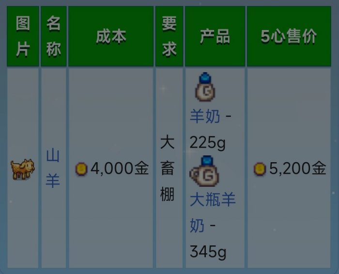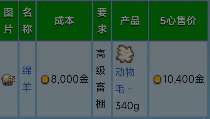 产品收获周期:绵羊已喂食且心情值大于70的话,它们的毛每3天生长一次。
